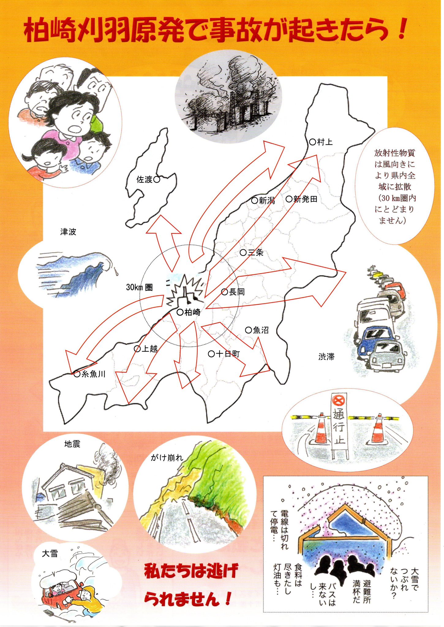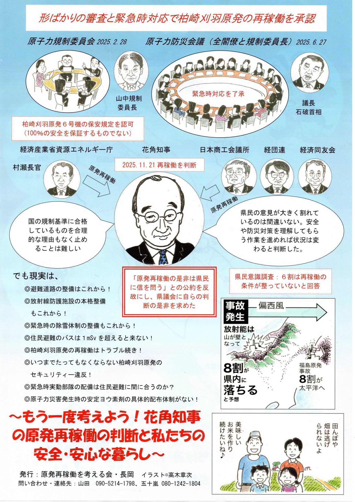 「原発再稼働を考える会・長岡」では、柏崎刈羽原発で事故が起きた場合の影響や、原発をめぐる花角知事の問題点をわかりやすくまとめたチラシを作成しました。