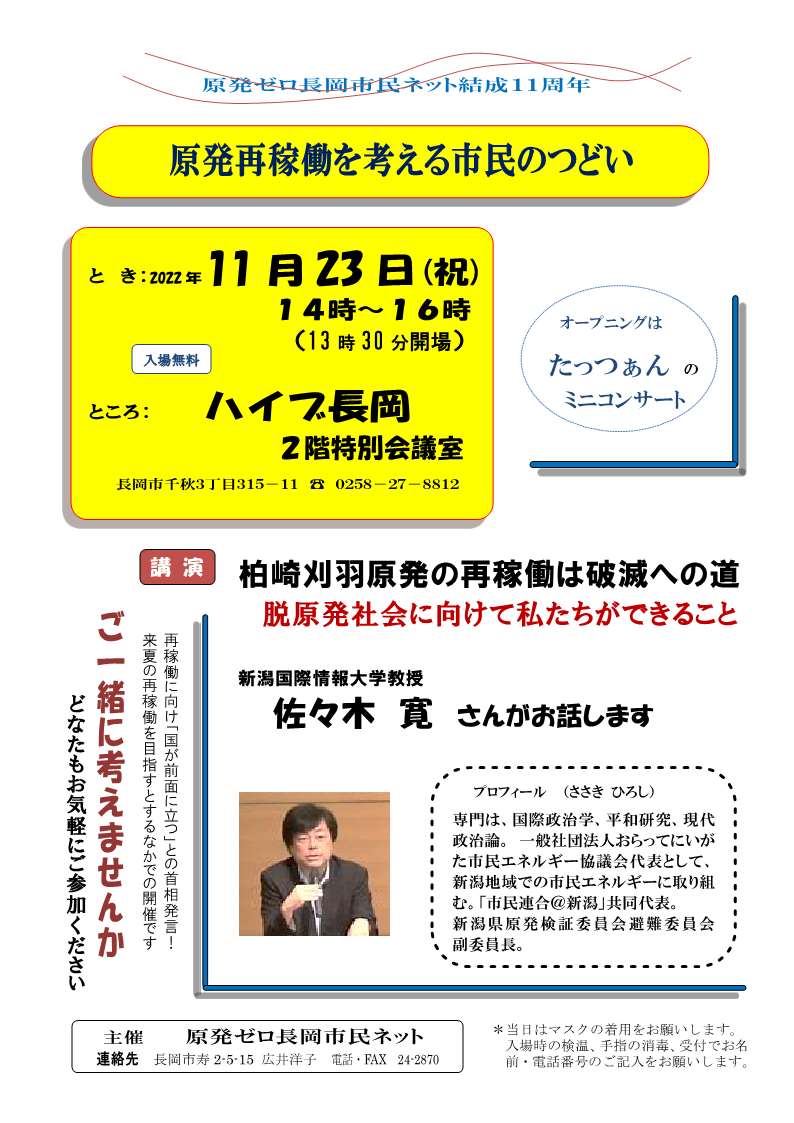 佐々木寛さん(新潟情報大学教授)が緊迫する原発問題の今と未来についてお話しいただきました。