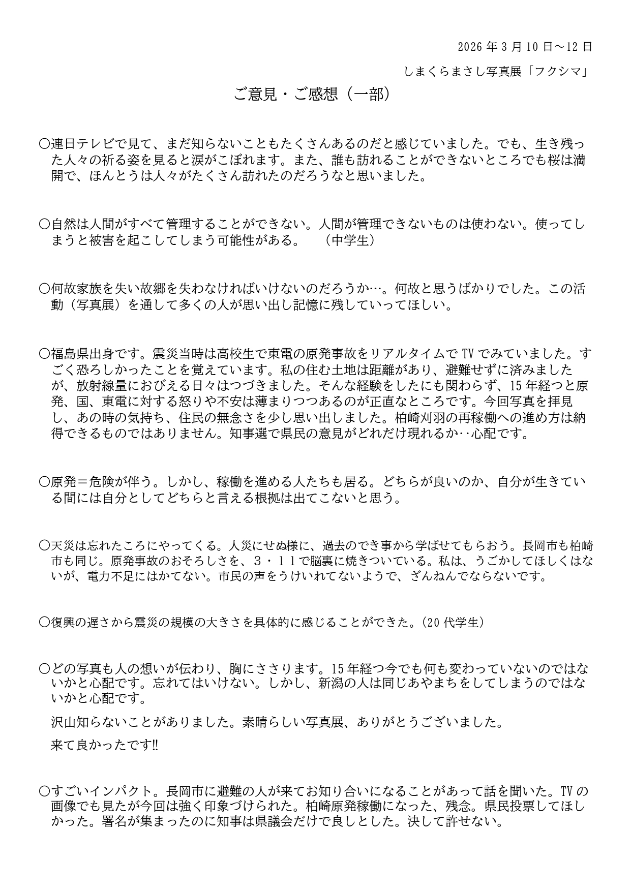 福島第一原発事故を忘れないための「3・11集会」に合わせて開催した、「しまくらまさし写真展『フクシマ』」が終了しました。