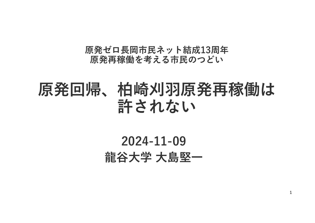 1970年代からの柏崎市などのデータを基に、原発の持つ危険性や事故による巨額な損失にふれながら、なぜ再稼働しようとするのかについてわかりやすく説明していただきました